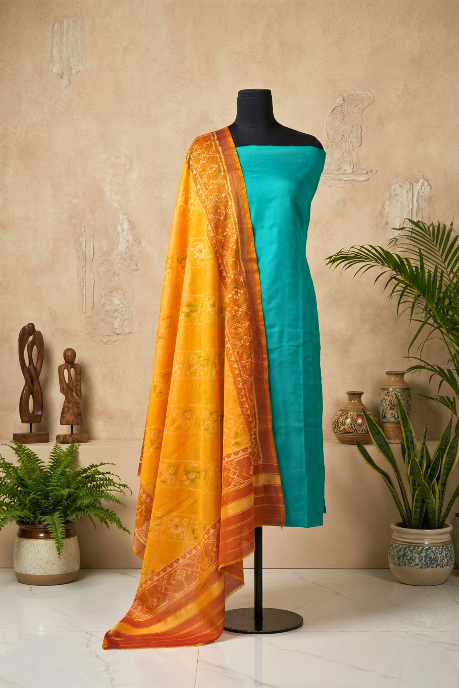 Teal Blue with Patola Print Dupatta Unstitched Suit