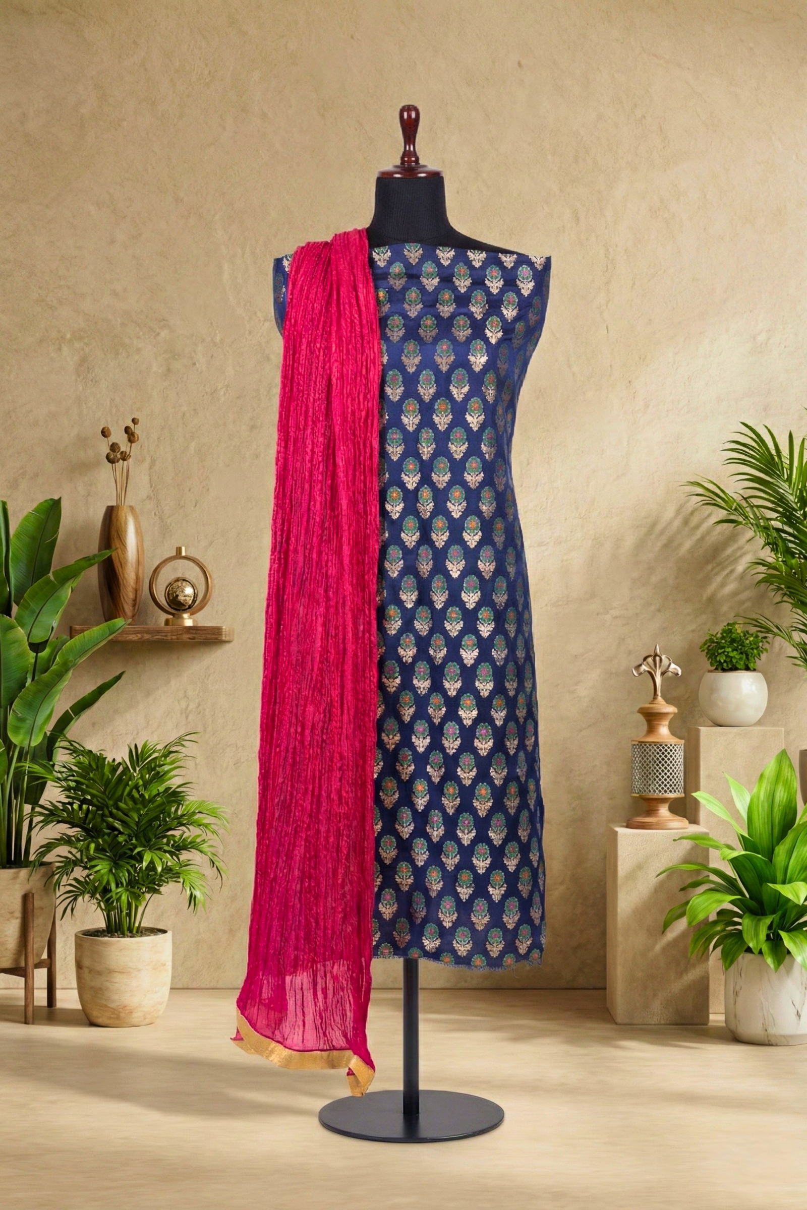 Royal Blue Brocade Unstitched Suit Set with Crushed Fuchsia Dupatta
