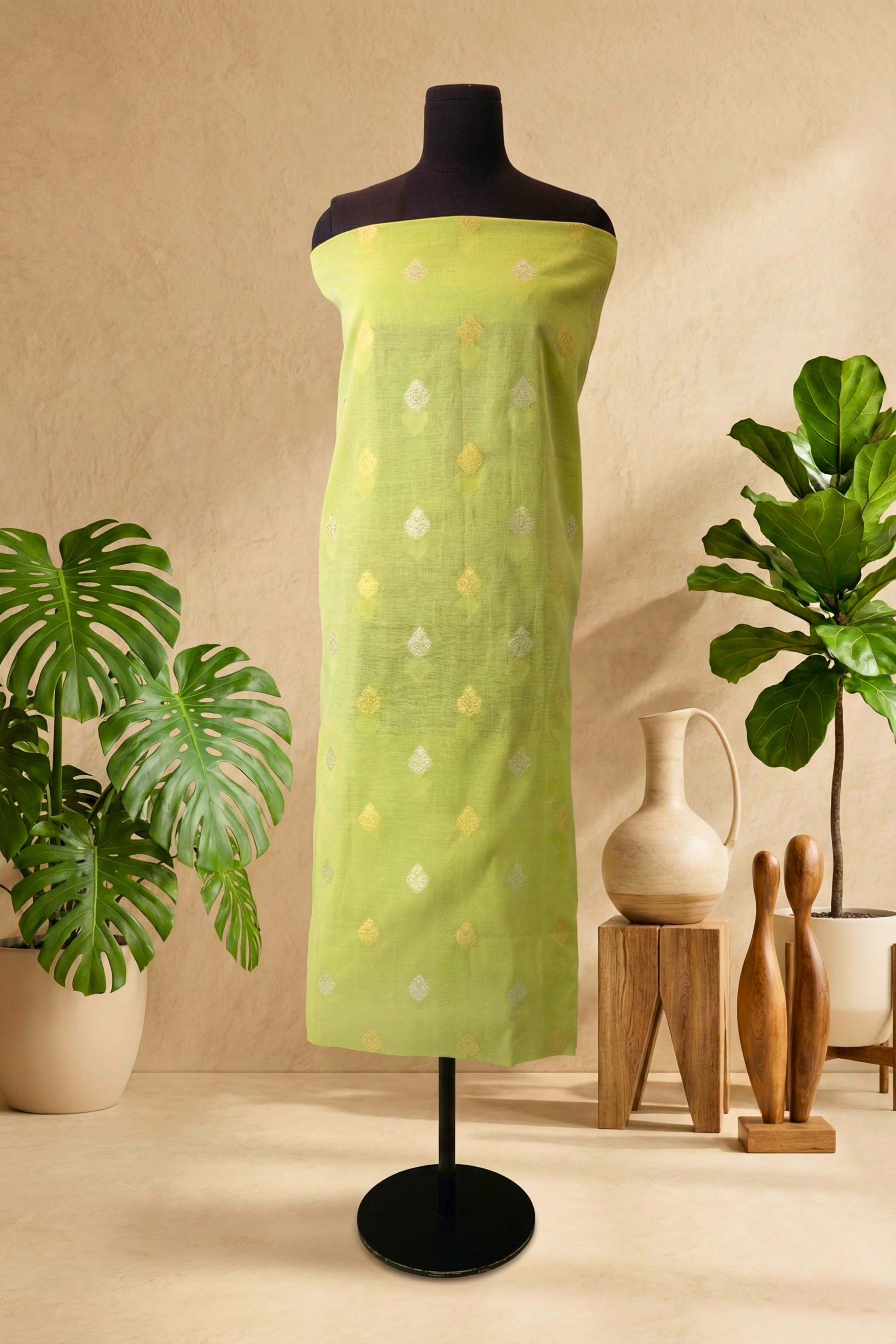 Lime Green Chanderi Top Bottom Unstitched Suit Material