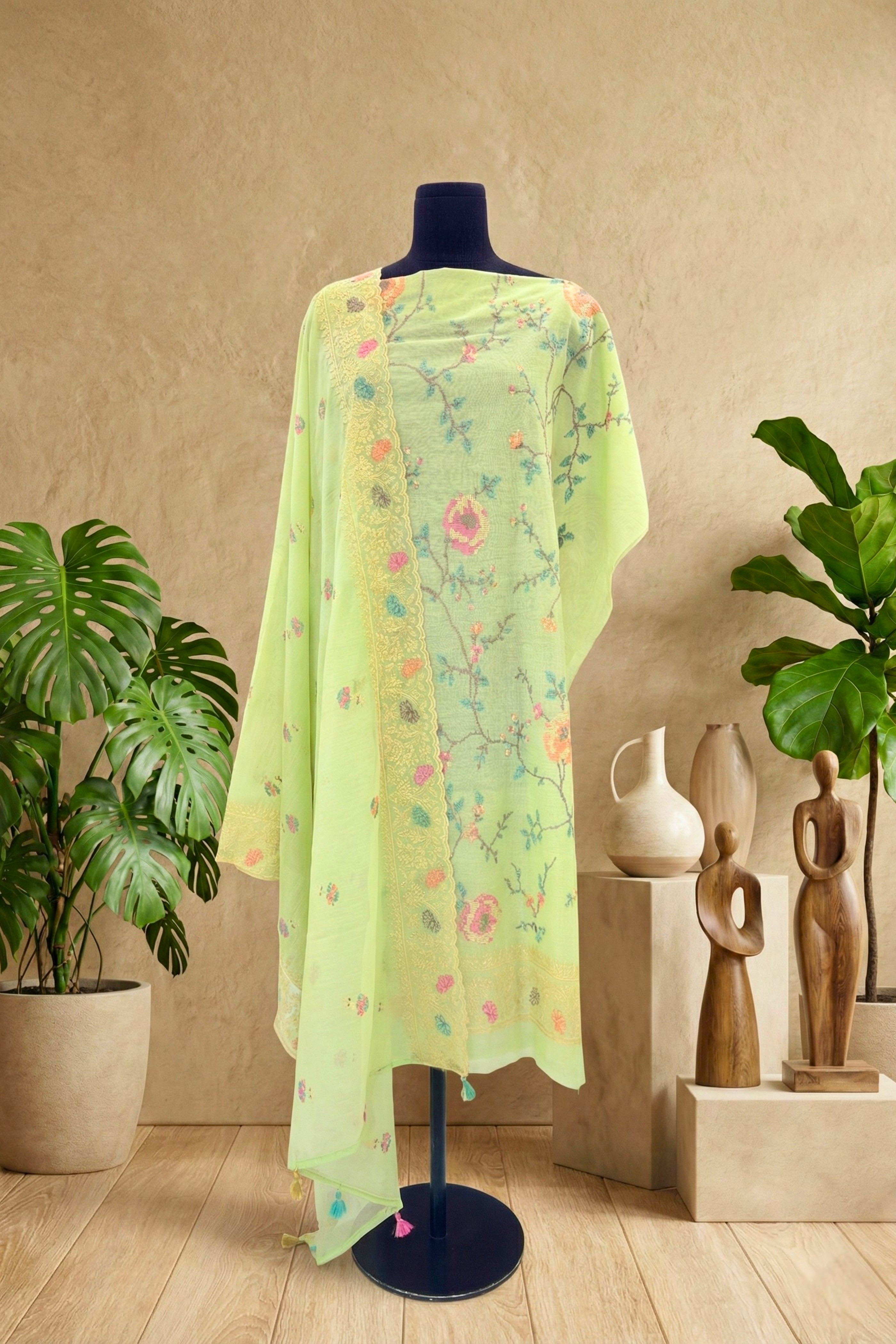 Vibrant Lime Green Mul Chanderi Unstitched Suit Set
