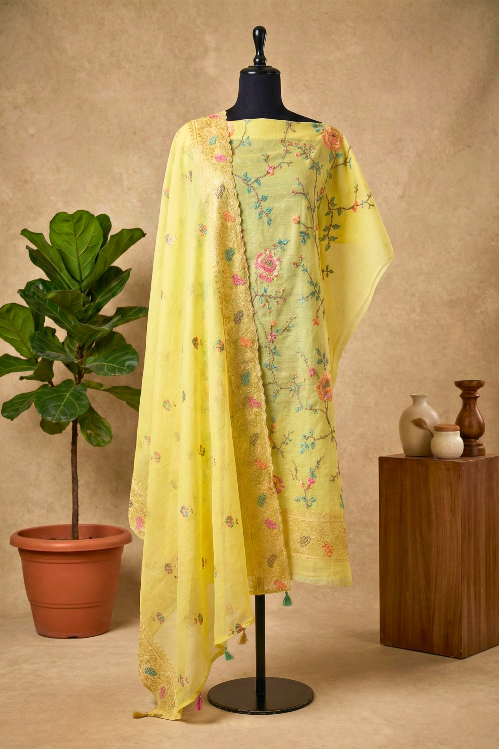 Sunshine Yellow Mul Chanderi Unstitched Suit Set