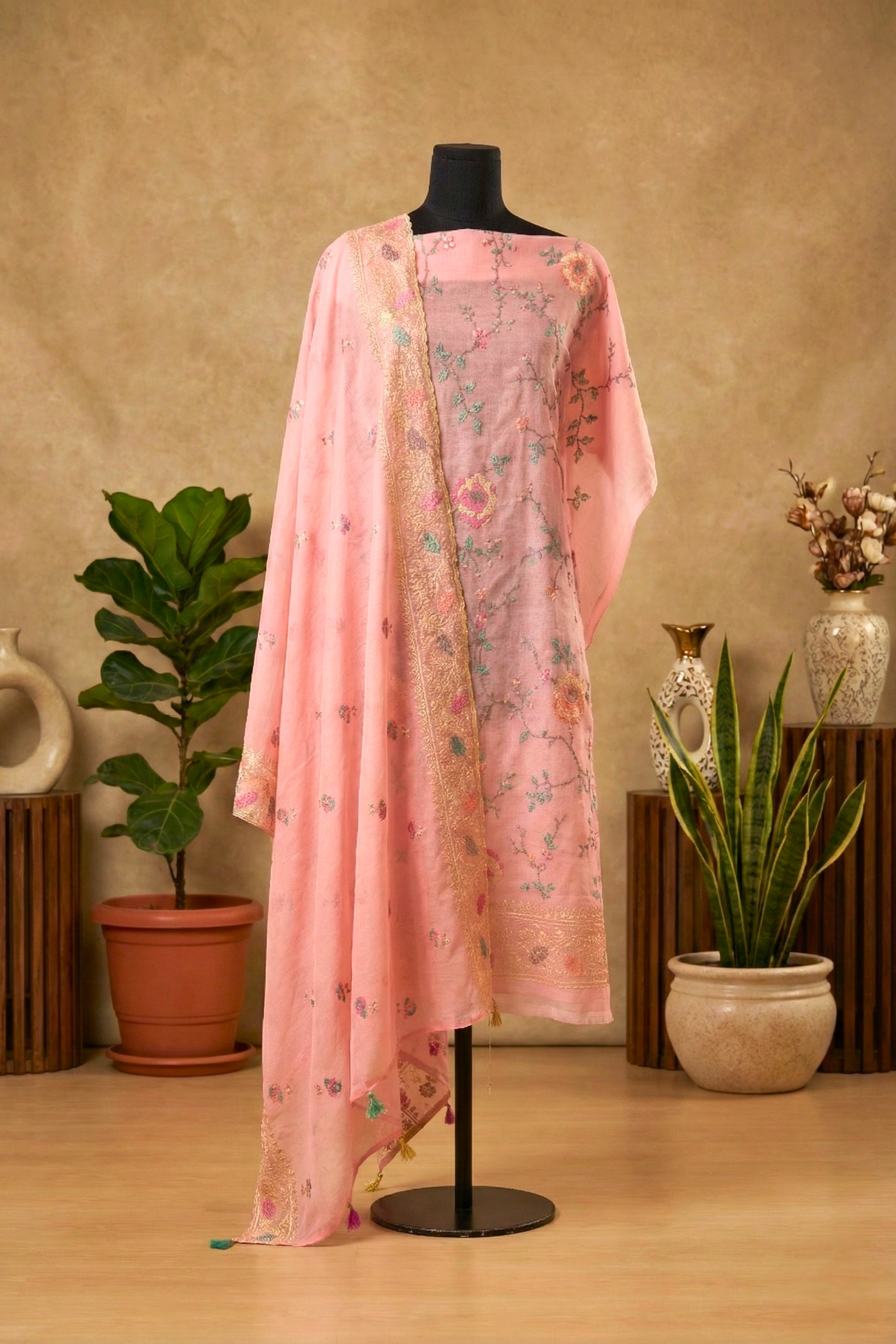 Blush Pink Mul Chanderi Unstitched Suit Set