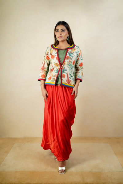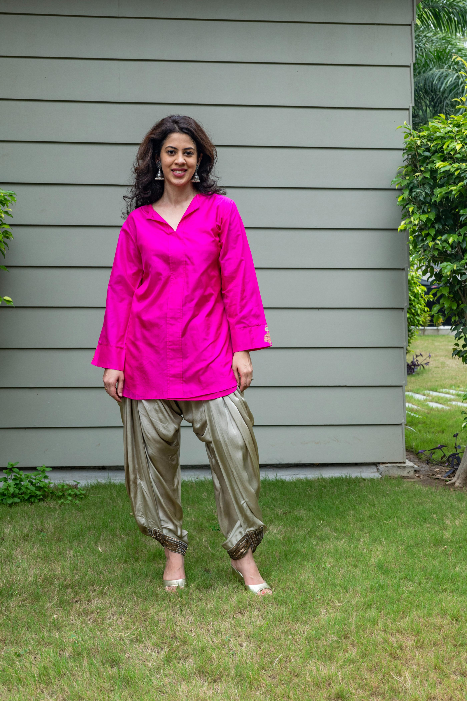 A fun fusion outfit, Shirt made with hot pink soft Bangalore silk with fine sleeve detail with a woven jhumka motif, the top comes with a matching inner slip. The shirt is paired with a drape easy and comfortable dhoti pants completing a trendy chic look. With fine antique work at the ankle this versatile dhoti pant can be paired with almost any shirts, tops or kurtas.