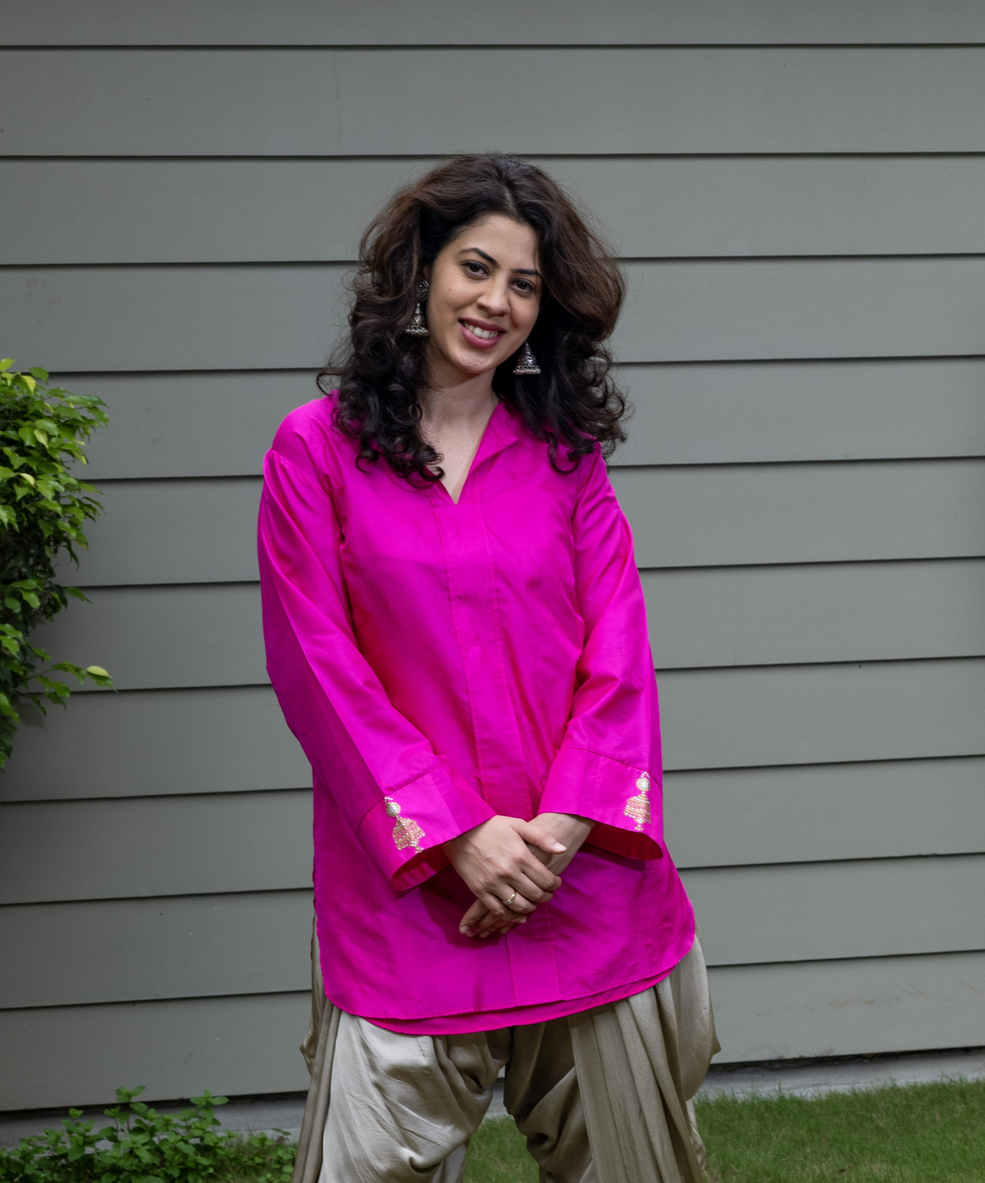 Shirt made with hot pink soft Bangalore silk, fine sleeve detail with a woven jhumka motif, the top comes with a matching inner slip. Shirt can be well paired with most silk pants or staple white/grey/ self pink western branded pants. Also paired with pallazo/dhoti