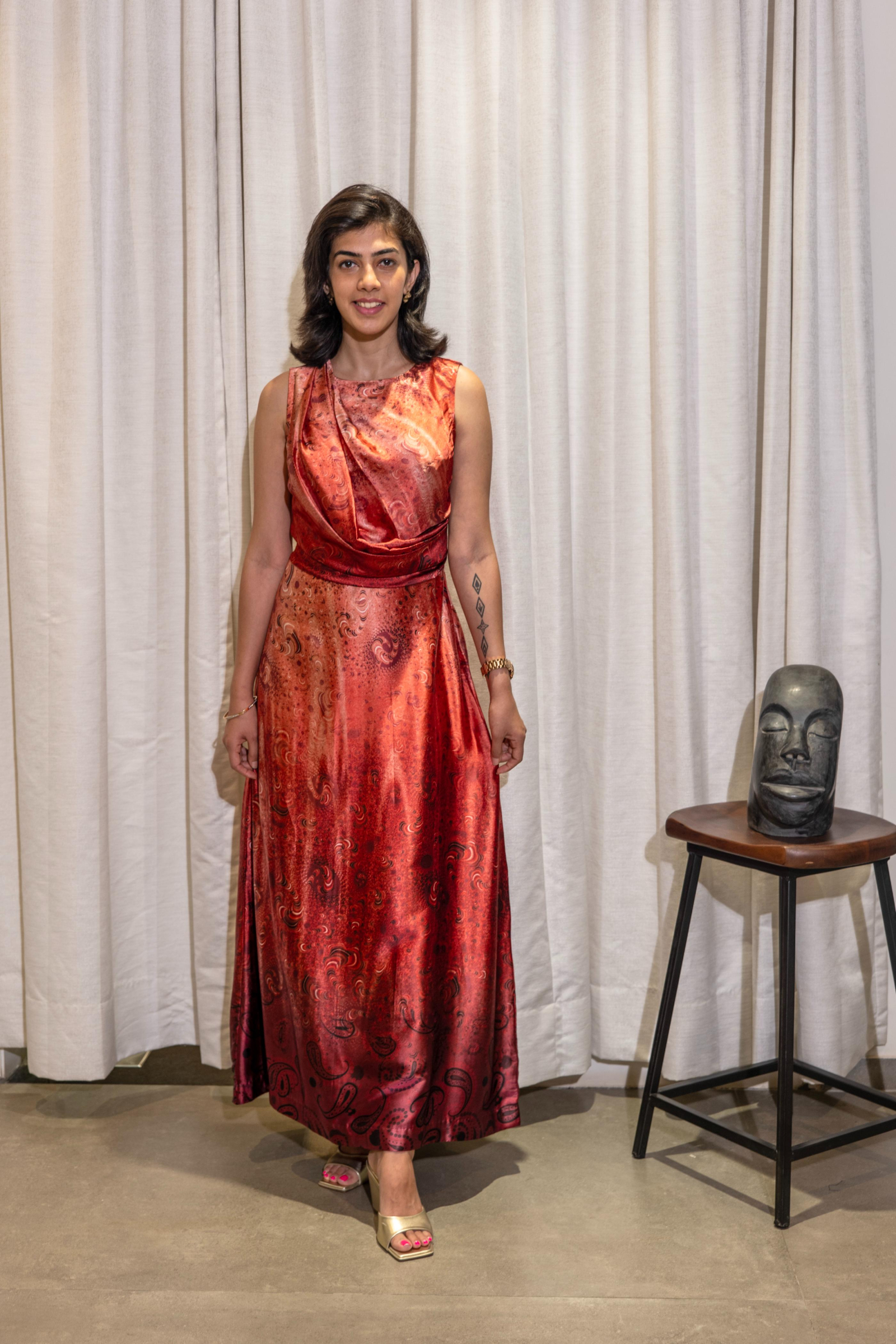 Long evening dress in a flowy fabric and unique print. Ombre shades of onion pink. The dress has a drape detail on the top part.