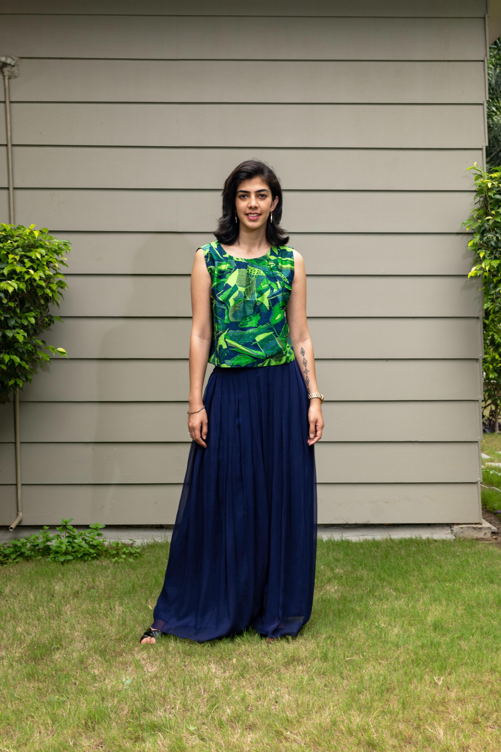 The top is made with unique printed soft raw silk with pleat detail in style. It’s a boxy fit top. The bottom is made with flowing navy blue georgette pallazo pants.