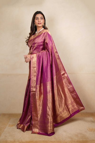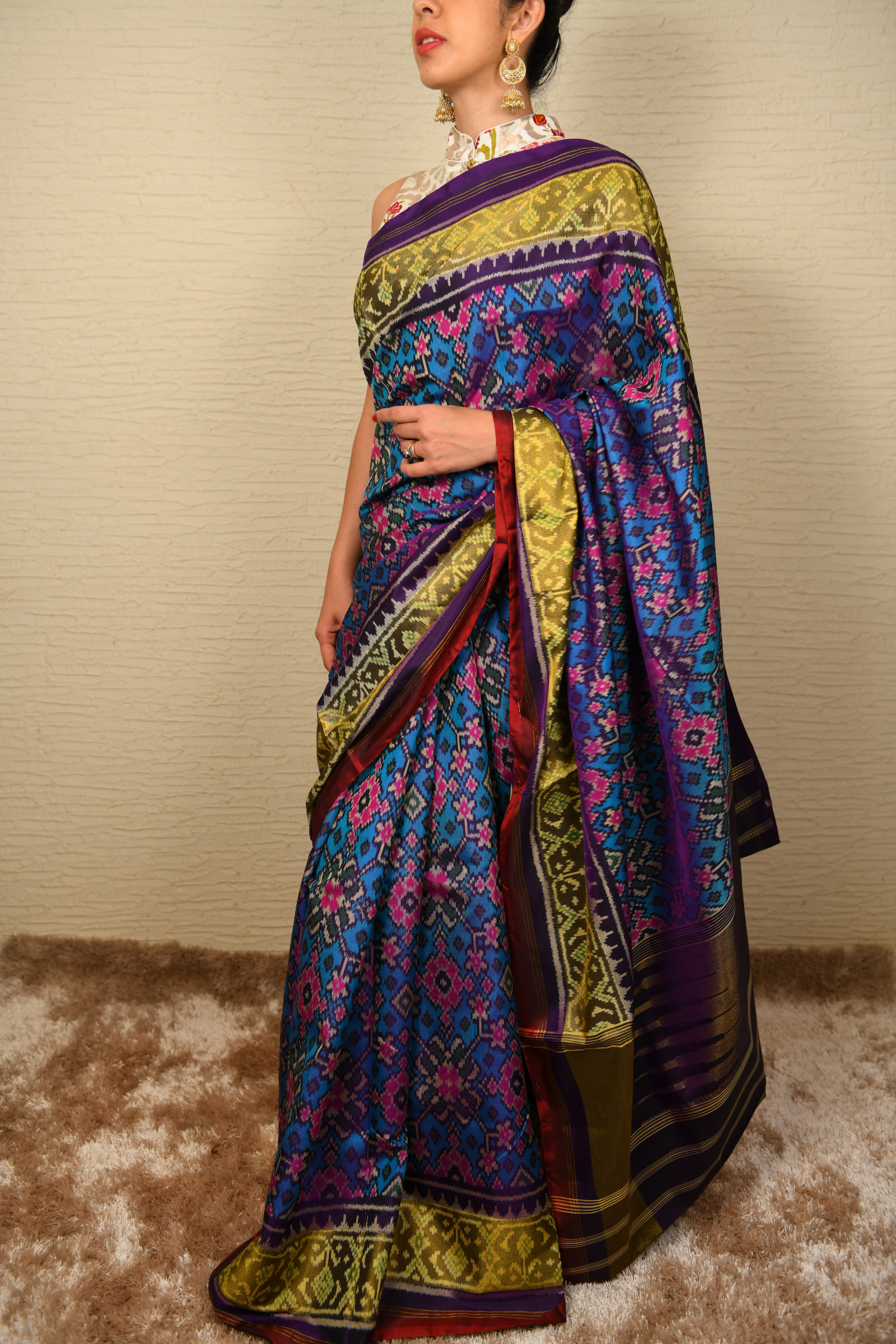 A beautiful array of colours in this age old traditional weave. Patola silk sarees are Gujarat's heritage and reflect radiance, colour and vibrancy in artistic patterns. A beautiful deep brinjal purple soft patola silk saree that is light and drapes easy.