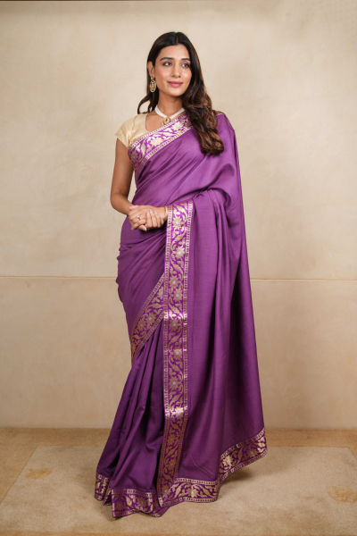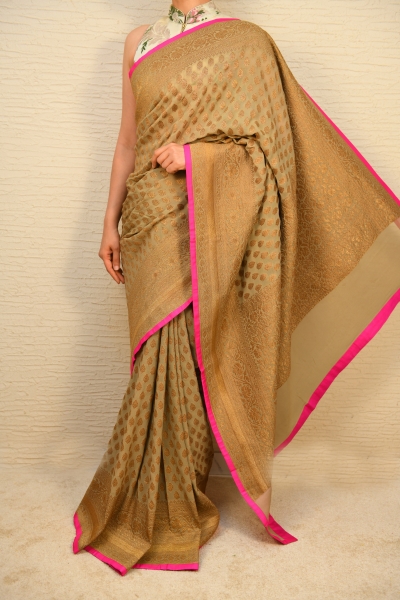 A conceptual stripe and checks earthen shade tussar silk saree with a teal blue pallu and blouse. The border pops in deep pink banarasi upada silk and a light hint of kundan hand work. A unique saree in an elegant colour combination.