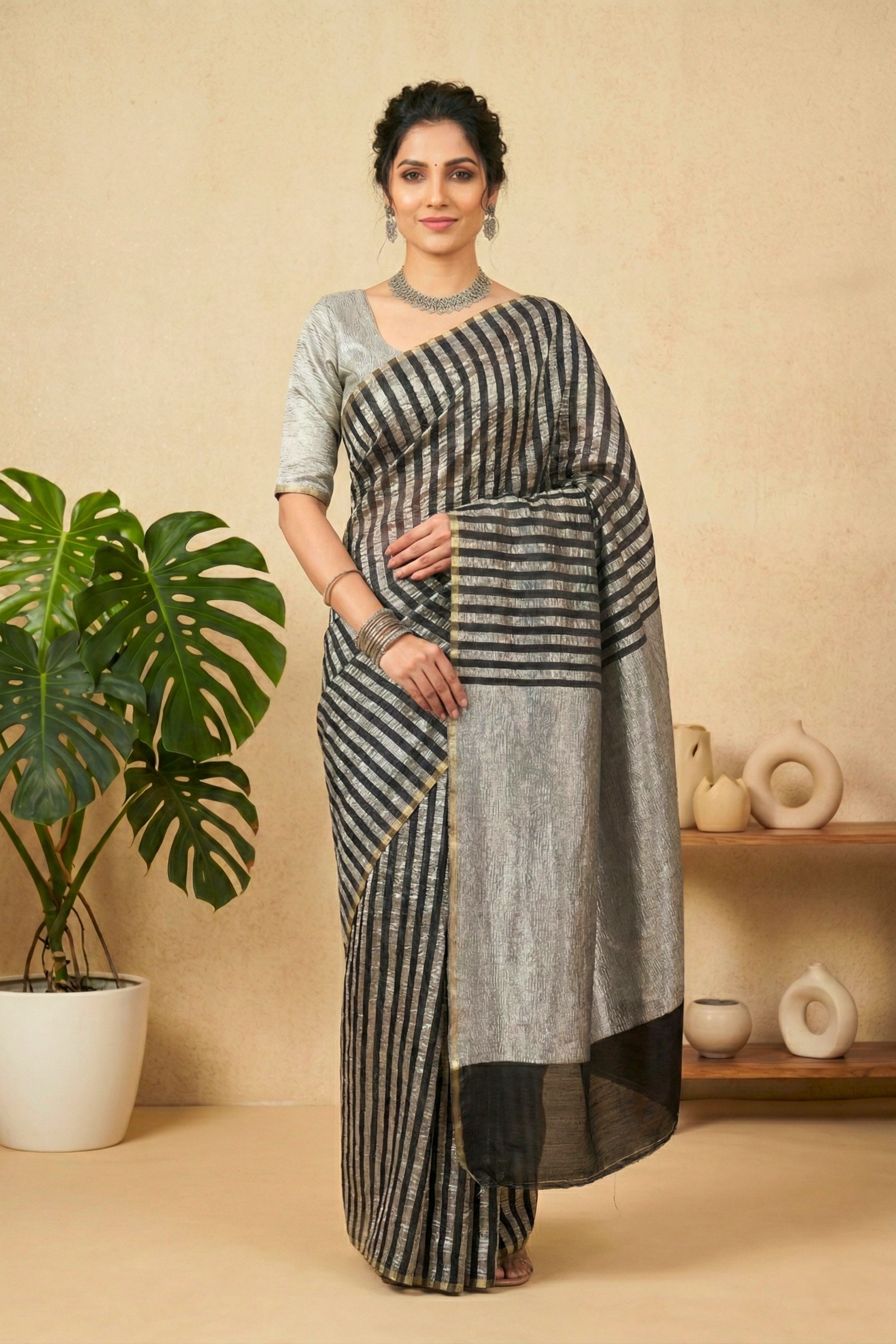 Pattern: Multi-directional stripes throughout the body that transition into a solid silver-toned pallu with a bold black finishing block.