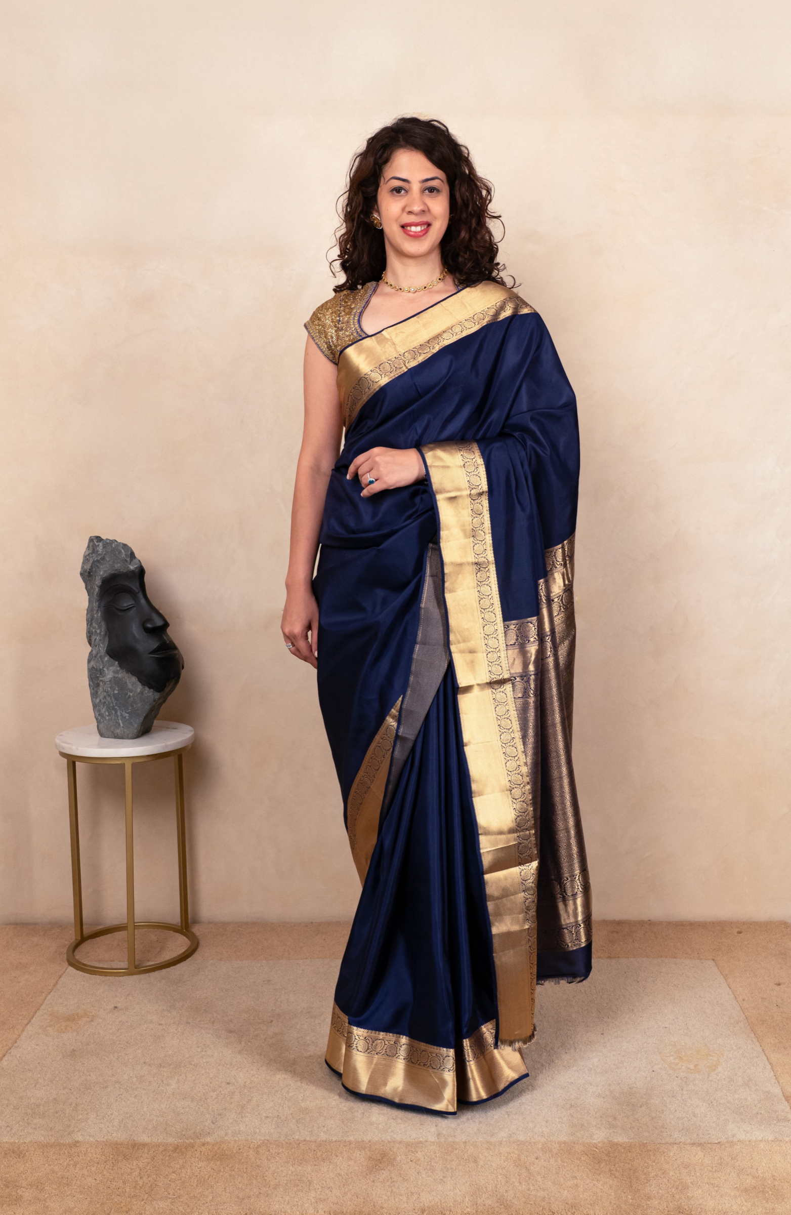 A rich indigo soft south silk saree with heavily embellished with traditional vines and floral golden zari work paired with self unstitched blouse piece. The perfect saree for festive ceremonies and cultural event.