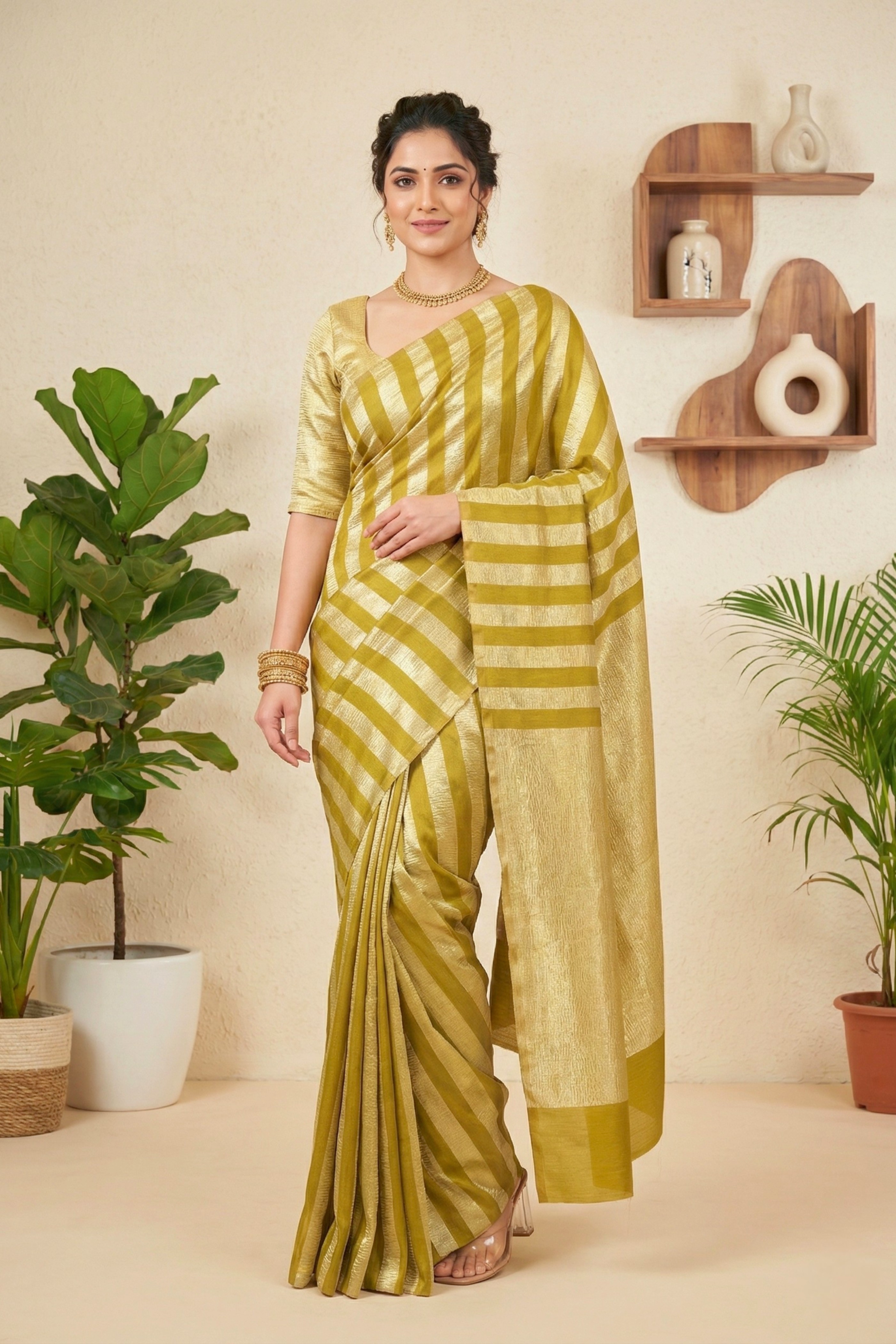 Elevate your ethnic wardrobe with this exquisite Olive Gold Moonga Silk Saree. Characterized by its signature metallic sheen and rich texture, this saree features a bold Leheriya-inspired diagonal stripe pattern that transitions into horizontal bands on the pallu, creating a dynamic visual appeal.