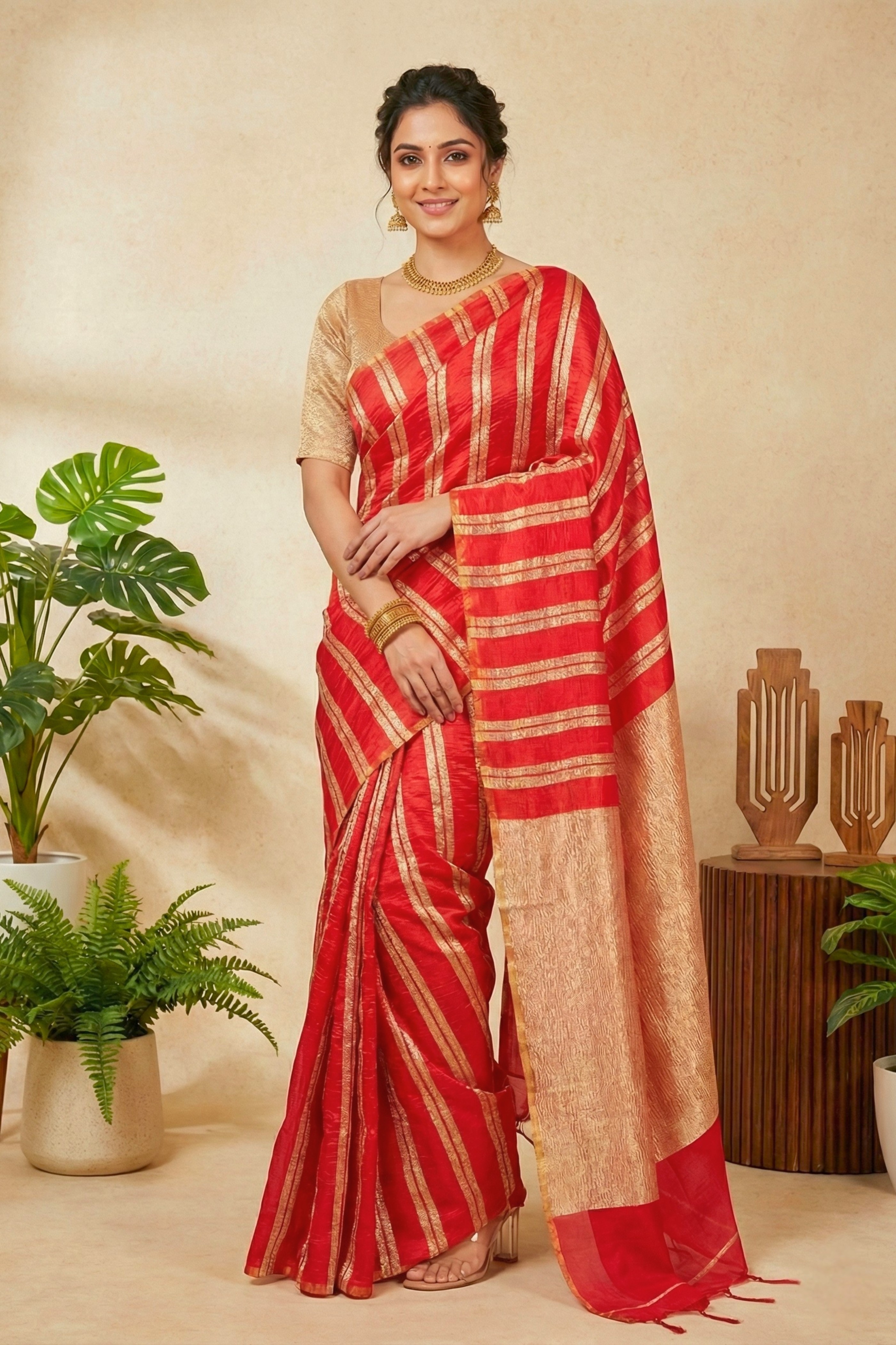The saree features a stunning linear design with shimmering gold Zari stripes running horizontally across the entire body, creating a captivating play of light. The look is completed with a heavy gold tissue pallu that adds a touch of opulence, making it an ideal choice for weddings and celebratory occasions.