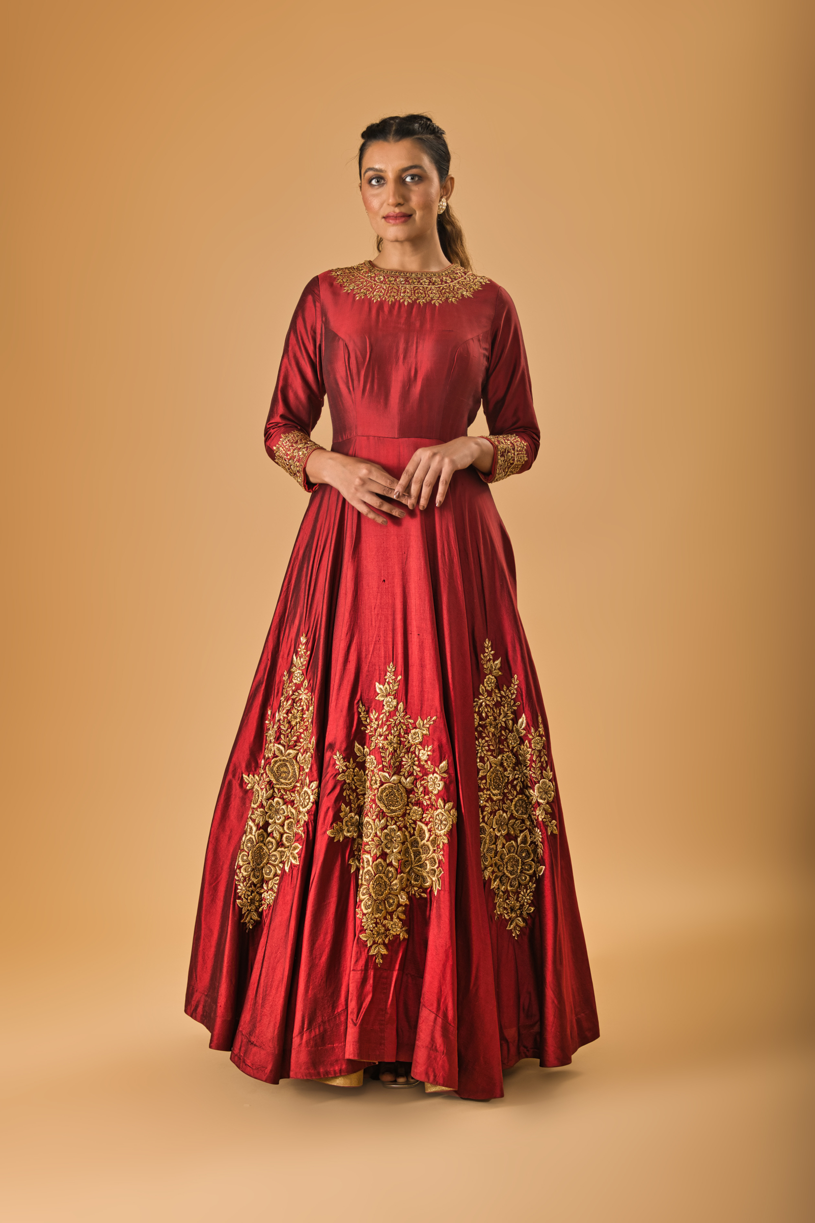 A rich and flambuyoant looking burgundy maroon silk gown with striking intricate gold embroidery on neck, hands and as big motifs all along the gorgeous flair. A statement pc for occasion wear.
