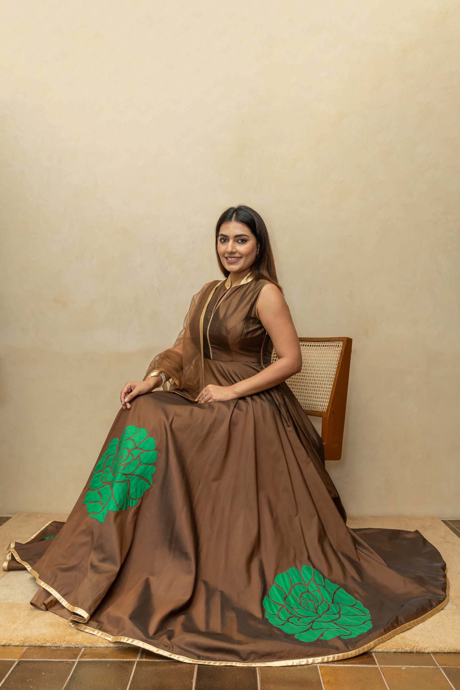 Soft and pure silk chocolate brown shade classic gown anarkali with unique rose patterned contrast silk applique work, paired with sheer dupatta and stretachable leggings. Additional cap sleeves are provided separately and can be attached.