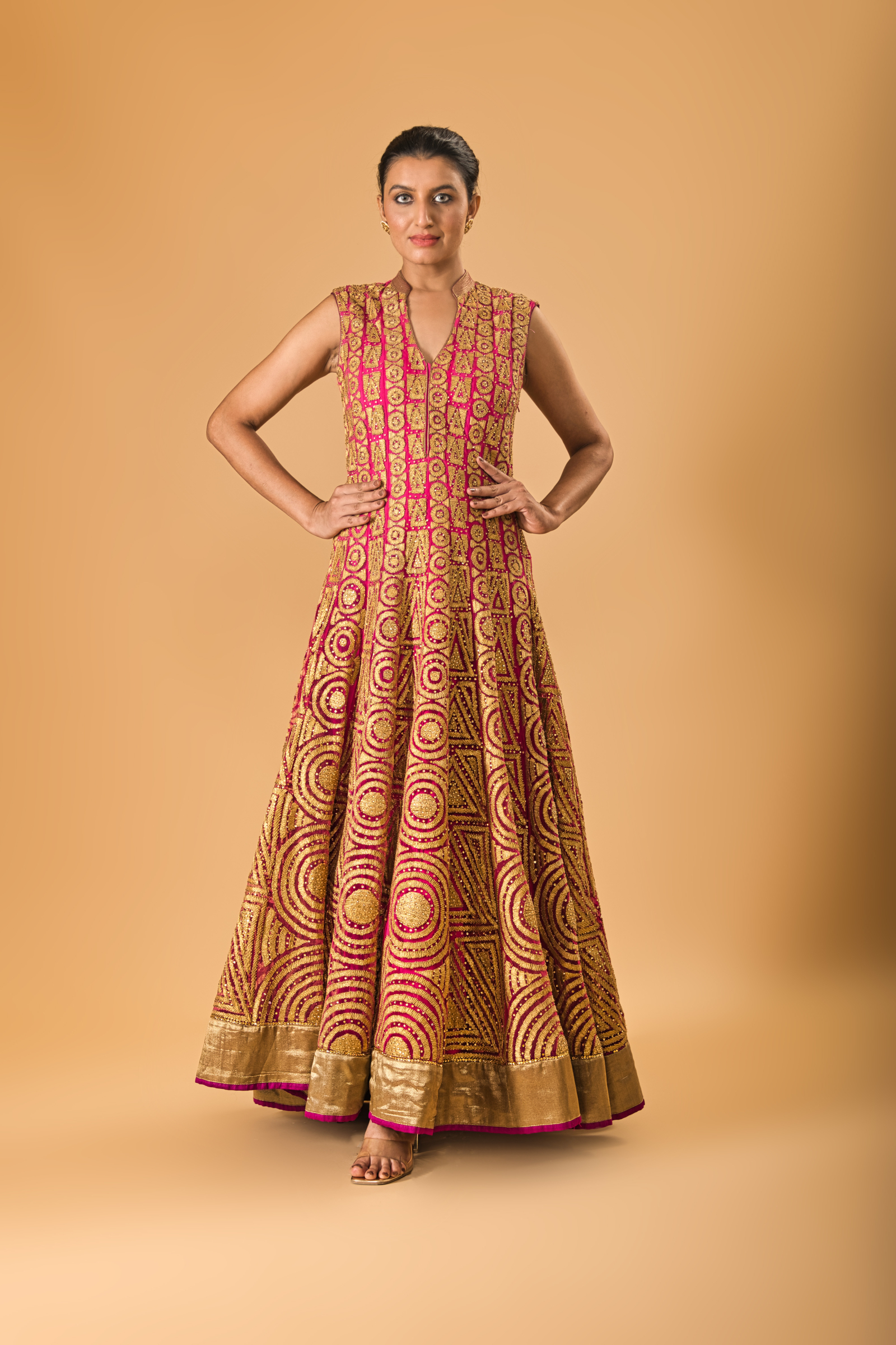 A beautiful fuscia pink very light weight gown with rich all over gold stone and applique embroidery. Royal occasion wear look yet so light in weight. Paired with free size lycra legging, attachable same embroidery sleeve and sheer soft net dupatta with similar applique embroidery.