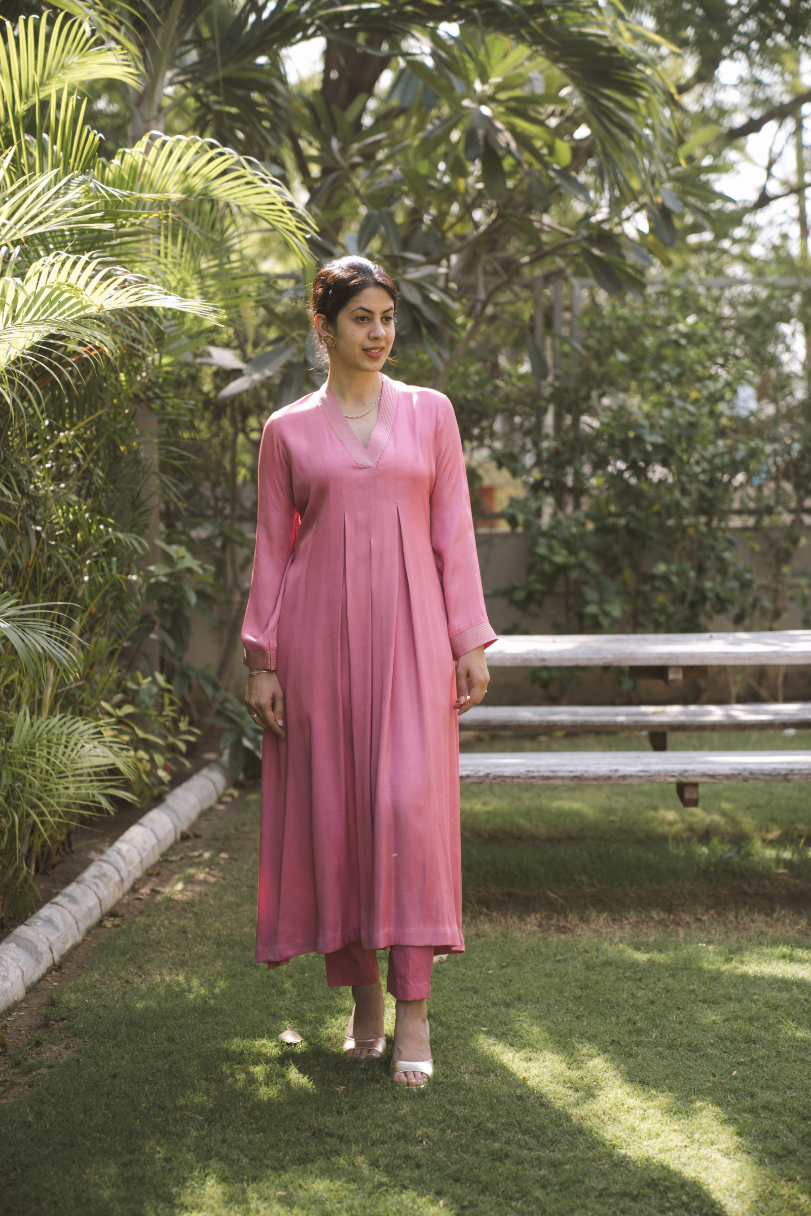 Soft flowing pure crepe pleated relaxed fit kurta and cotton satin pant set with intricate zari chain stitch finish in neckline, sleeve and pant ankle.