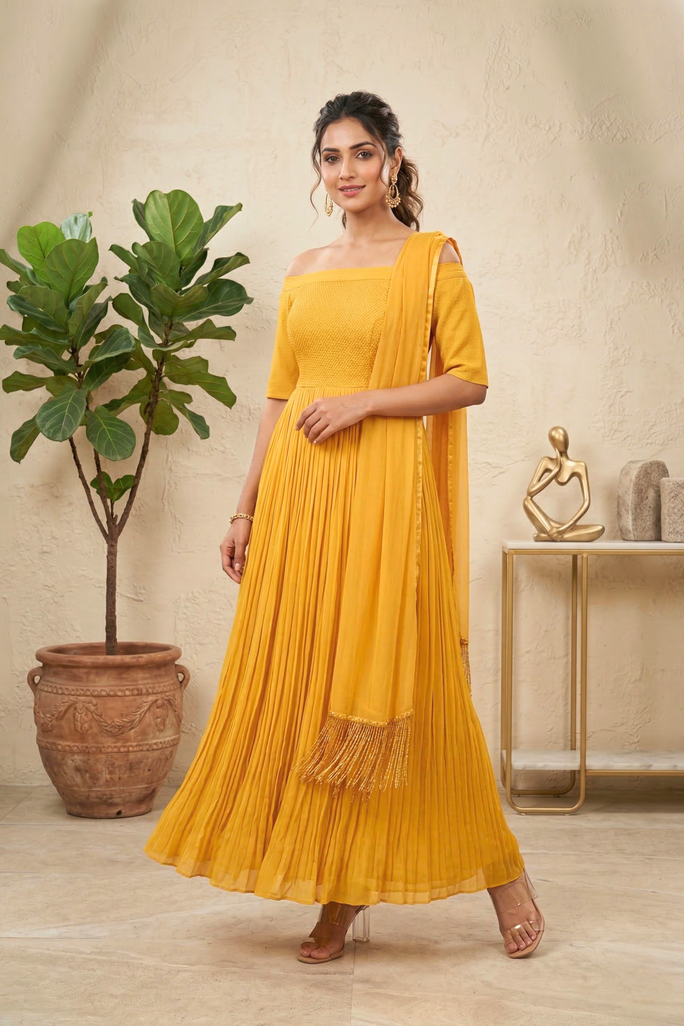 Off shoulder soft light chiffon gown paired with light dupatta with tassles detail and stretachable leggings. A beautiful day celebration attire.