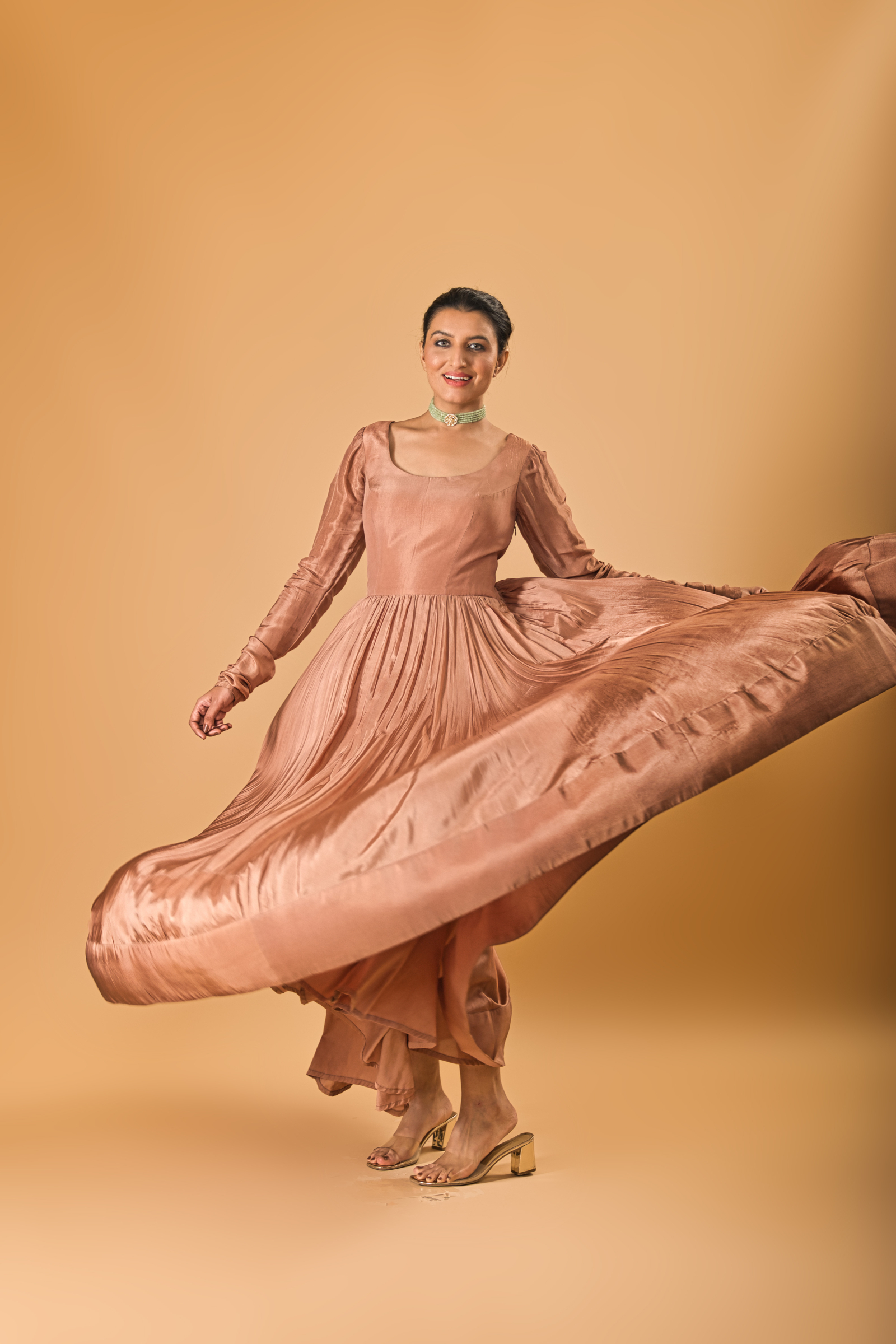 Soft crepe silk high flair anarkali with chudidar full sleeve and a wide neck deep to flaunt statement jewellery. A nude chikoo shade kalidar kurta that would match many dupattas and overlays.