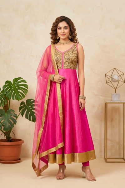 Majestic Rani Pink Raw Silk Embroidered Anarkali Suit Set