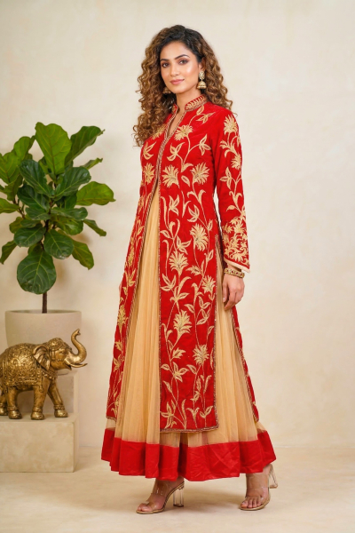 Deep Red And Gold Jacket Style Velvet Anarkali Suit