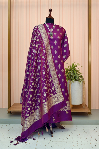 A bottle green banarasi semi silk (2.5 mtr) top with self bottom with banarasi work (2.5 mtr.) paired with Jal weave dupatta with tassel. An ideal look for wedding function and festive occasions.