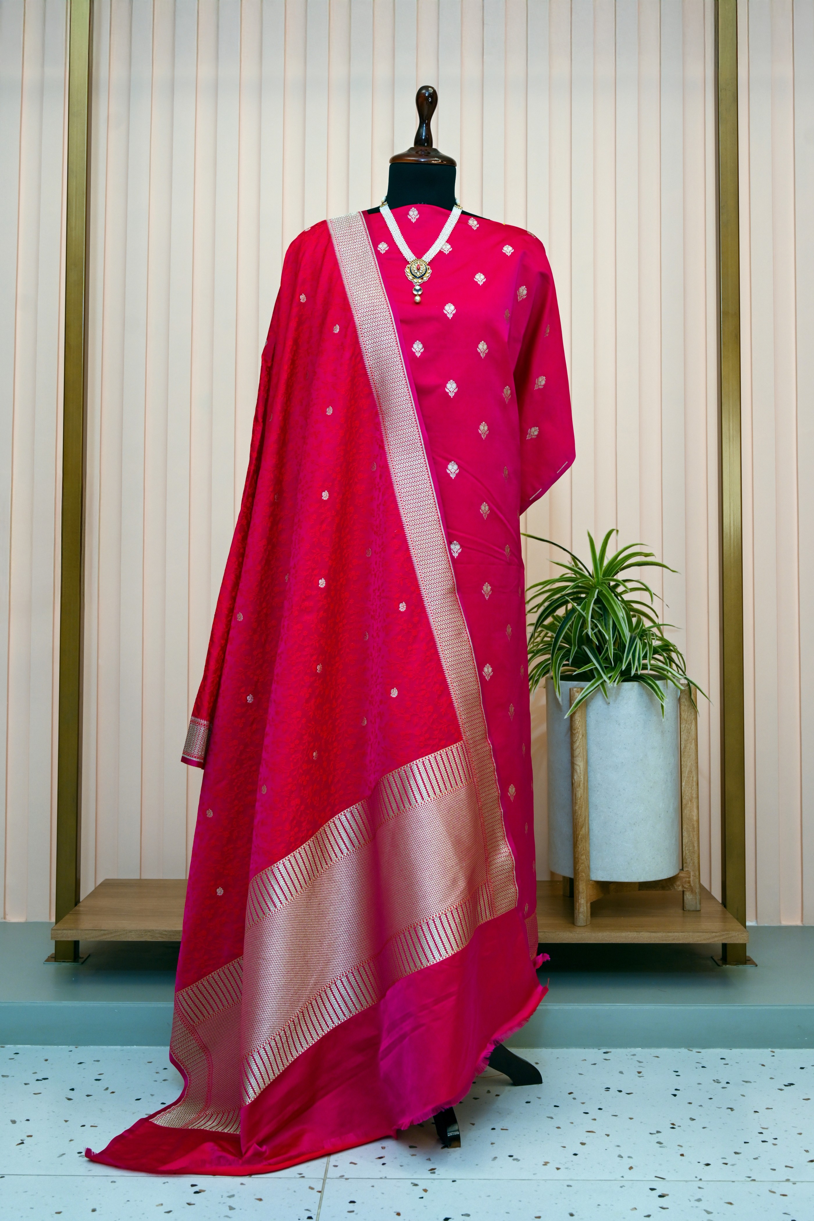 A dark hot pink tanchoi silk with zari weave bootas top material (2.5 mtr) with self bottom (2.5 mtr.) paired with self resham weaved and zari weave border dupatta. An ideal look for wedding function and festive occasions.