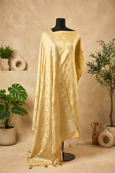 Step into timeless elegance with this exquisite Black Banarasi Semi-Silk Unstitched Suit Set. Perfectly blending traditional artistry with modern sophistication, this ensemble features a lustrous semi-silk fabric base in a deep, jet-black hue. The kurta fabric is adorned with delicate, all-over golden zari floral motifs that catch the light beautifully.