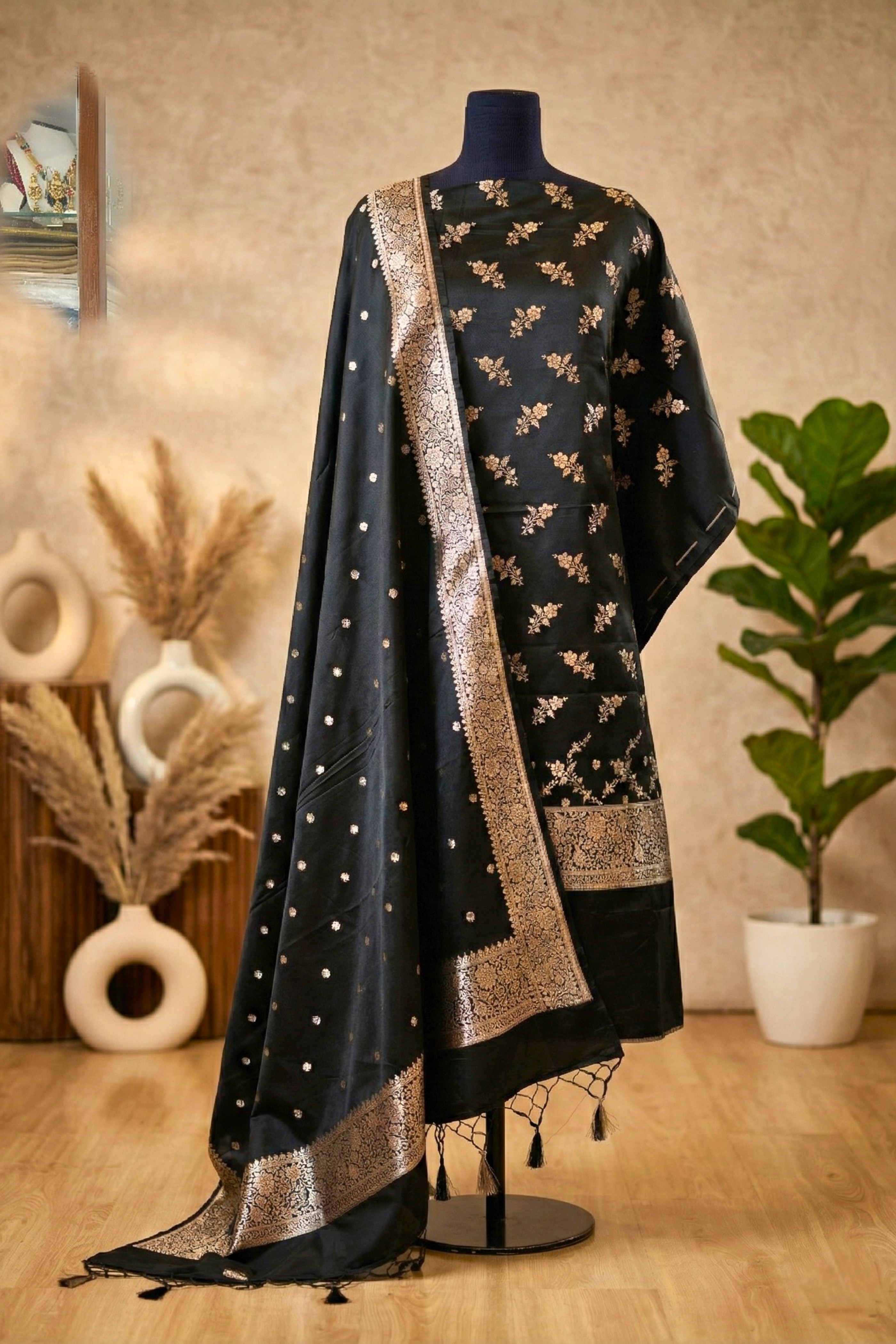 Jet Black Banarasi Semi-Silk Unstitched Suit Set