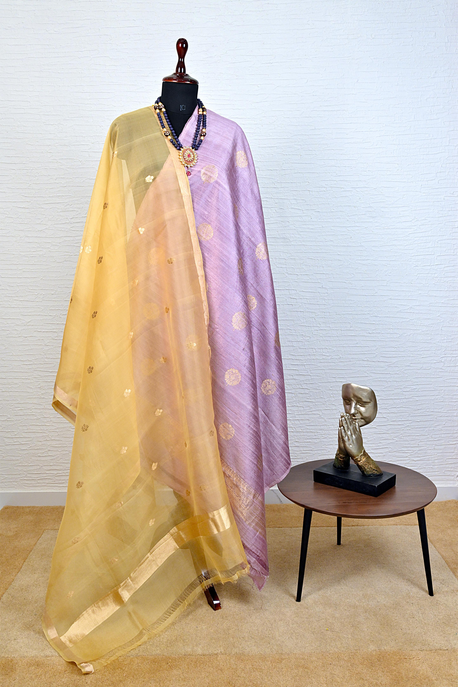 A soft raw silk lavender purple kurta material with fine banarasi weave bootas, self plain silk bottom material with a unique combination of pale yellow organza silk dupatta.