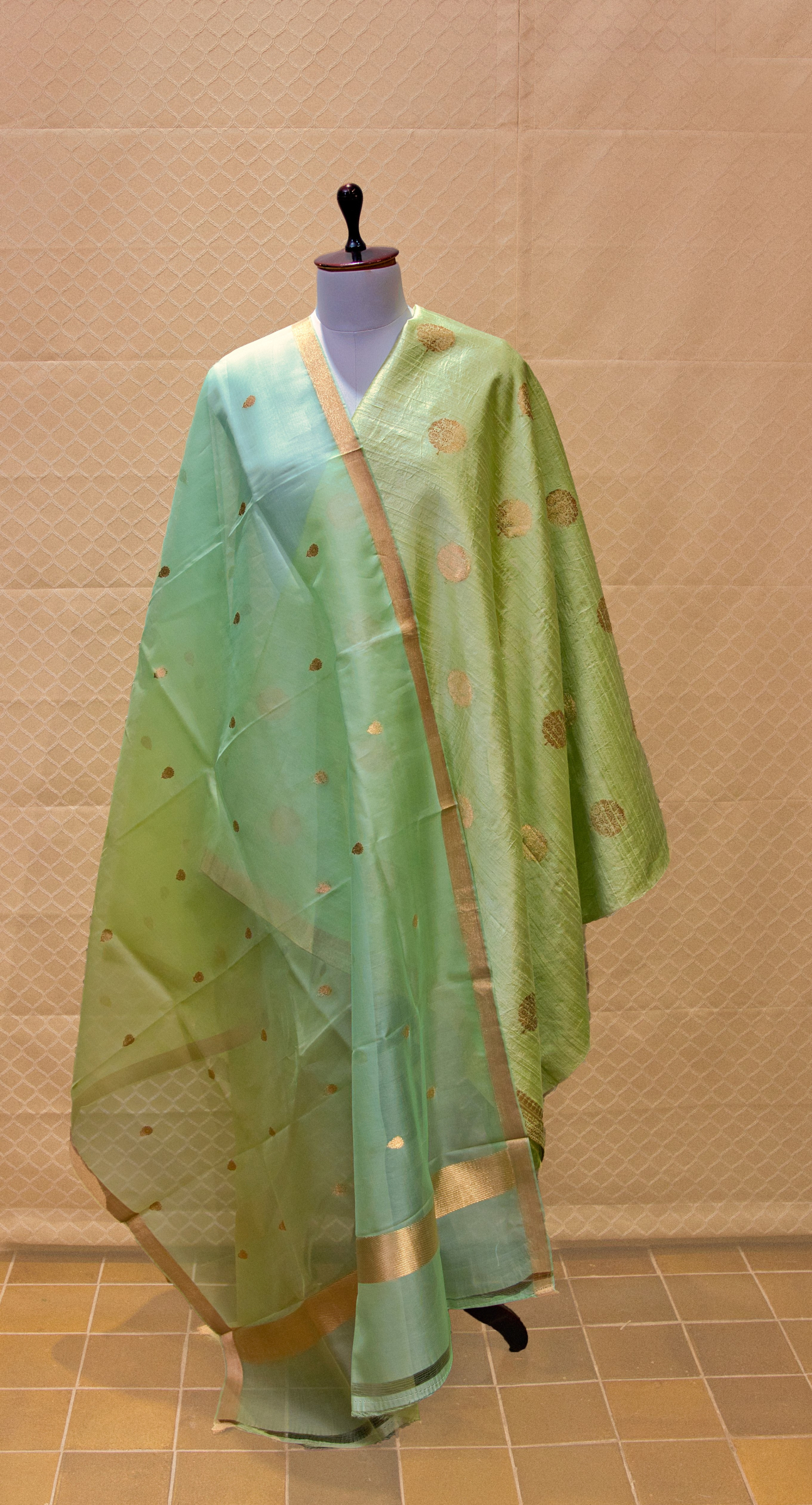A soft raw silk mint green kurta material with fine banarasi weave bootas, self plain silk bottom material paired with soft organza silk dupatta in ombre shades of green.