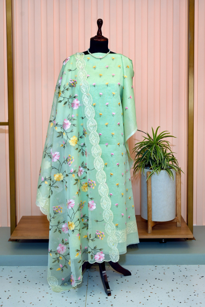 A classy off white floral threadwork organza suit material (2.5 mtr) with self bottom (2.5mtr.) paired with dreamy floral threadwork organza cut work dupatta. An ideal light and airy look for semi-formal occasions and daytime celebrations.