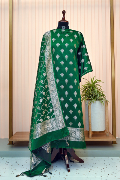 A rich purple banarasi semi silk (2.5 mtr) top with self bottom with banarasi work (2.5 mtr.) paired with Jal weave dupatta with tassel. An ideal look for wedding function and festive occasions.