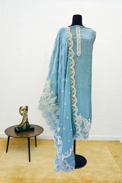 Embrace the timeless elegance with the exquisite rose pink chanderi comfortable (2.5 mtr) top material with straight slit neckline adored with intricate of white lace embroidery panel paired with self bottom (2.5 mtr) and beautifully complemented with a delicately embroidered dupatta making it a perfect choice for festive gathering, traditional events or elegant daywear.