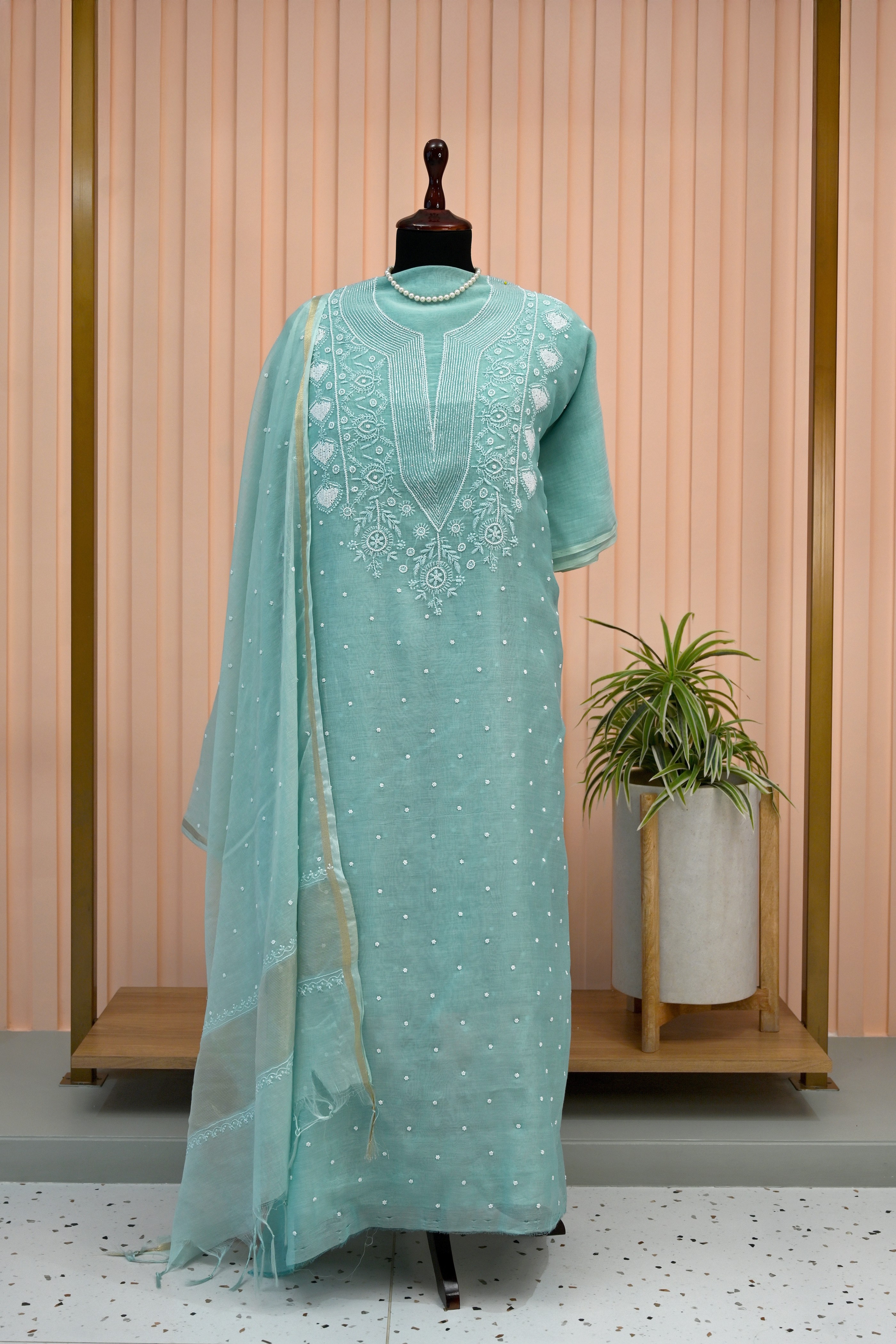 Sea Green mul chanderi chikankari beads and threaded embroidered top (3mtr) with the designer subtle cut and embroidery neckline paired with self mul chanderi dupatta with gold zari line touch. A perfect blend of grace, tradition and comfort.