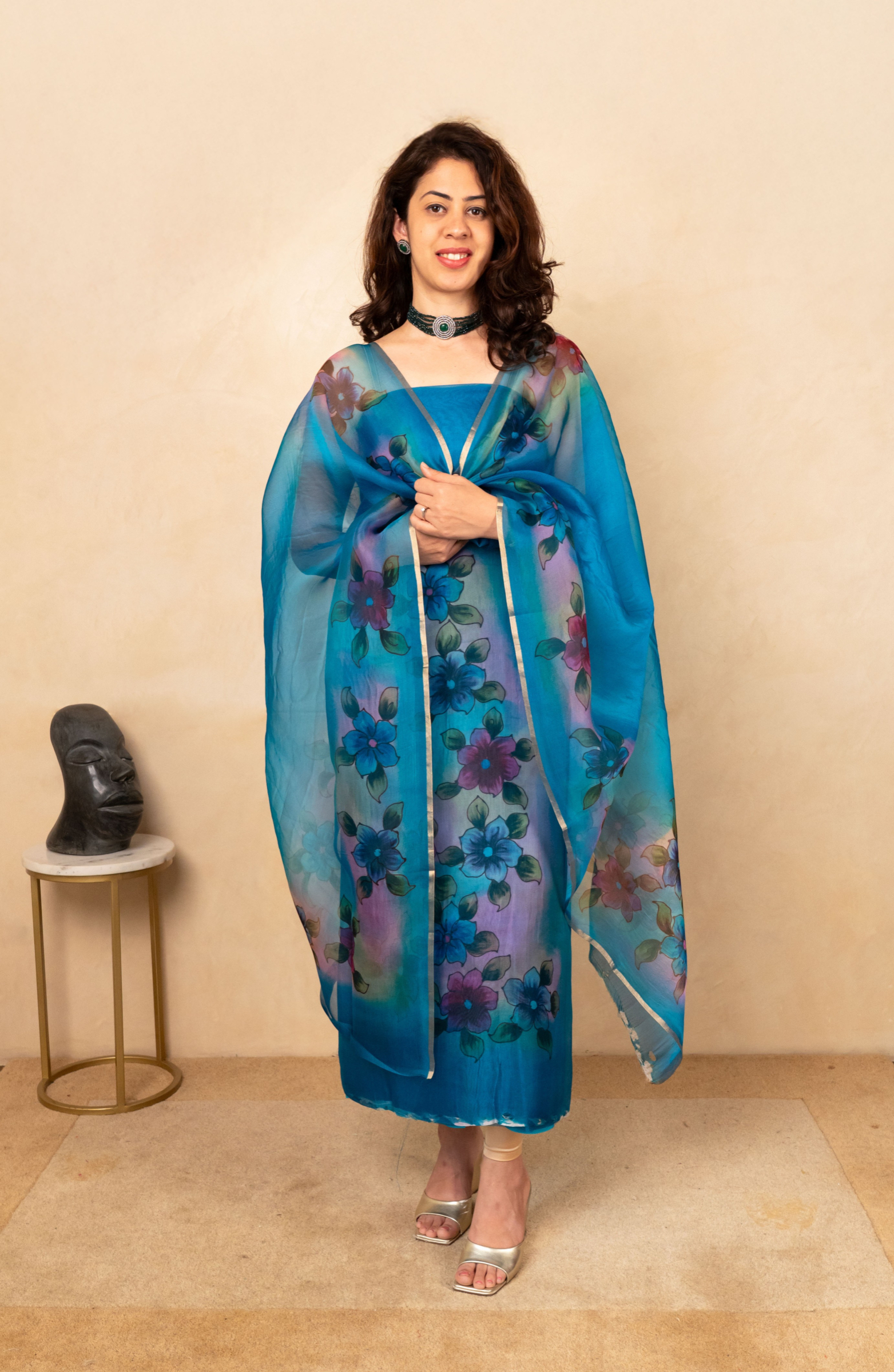 A classy turquoise blue floral printed organza suit material (5 mtr) with self floral print organza dupatta. An ideal light and airy look for semi-formal occasions and daytime celebrations.