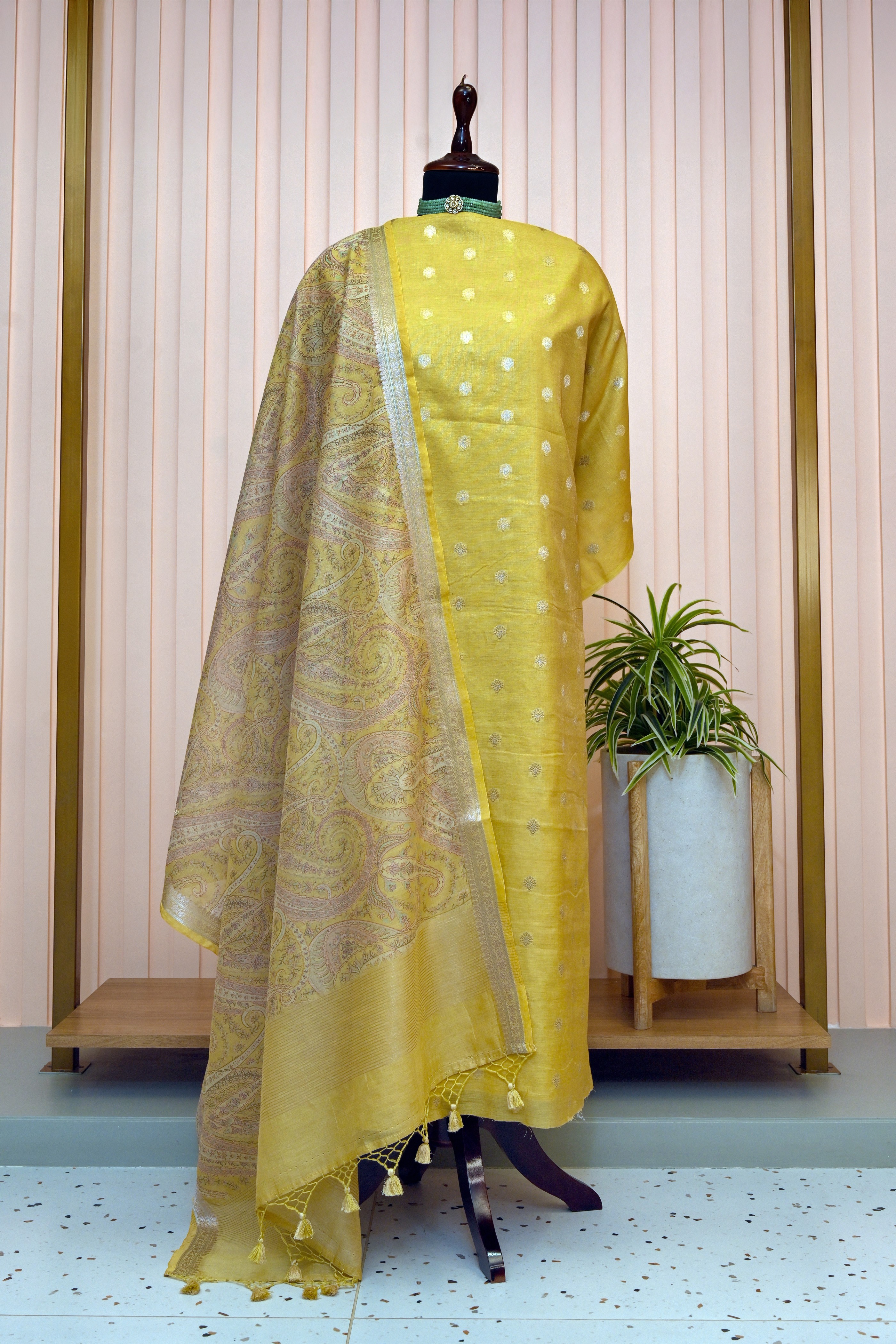 A yellow cream chanderi tissue with zari weave bootas top material (2.5 mtr) with self bottom (2.5 mtr.) paired with self printed dupatta with tassel. An ideal look for daytime event, festive gatherings, or even casual traditional wear.